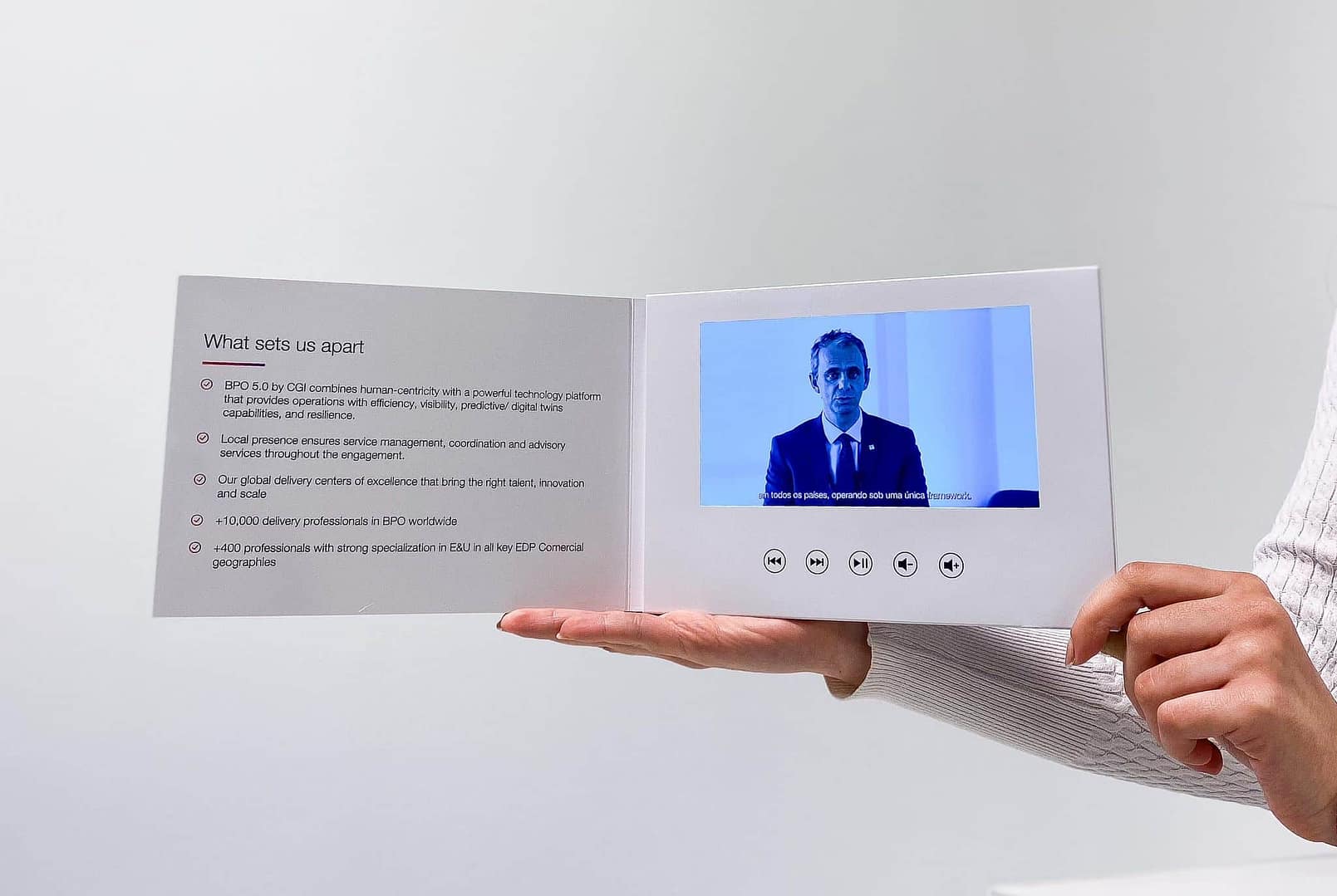 Esta é uma solução invulgar e inovadora na comunicação de qualquer empresa! Funciona muito bem como divulgação de campanhas de marketing, promoção de empresas/entidades, produtos e até mesmo serviços! Ao abrir a Vídeo-Brochura o filme (neste caso, o vídeo institucional da CGI) é reproduzido automaticamente, sendo possível controlar o seu volume, som estéreo e até mesmo recarregá-la através de um cabo USB! Fácil, não acha? 😊